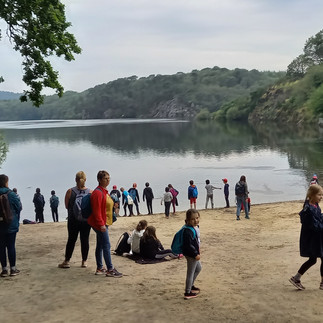 Malgré une météo menaçante, nous sommes partis à pied au lac de Guerlédan à 9h30. Nous avons traversé le bois près de l'école, continué vers la plage du rond-point puis nous avons emprunté un sentier assez difficile pour nous diriger vers le barrage (Nadia nous en avait parlé la veille). Joli point de vue! Nous nous sommes ensuite dirigés vers la carrière. Puis nous avons poursuivi notre randonnée vers Landroannec.